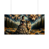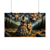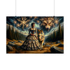 "La elegía de una tempestad" captura una escena de intensidad dramática donde la fuerza indómita de la naturaleza se encuentra con la gracia estoica de una época pasada. En medio de un paisaje salvaje y melancólico, bajo un cielo lleno de danza de relámpagos y nubes siniestras, se encuentra una mujer. Ella es la encarnación de la elegancia y la resistencia, vestida con un suntuoso vestido victoriano que susurra el encanto y la sofisticación del viejo mundo. A su lado, un lobo majestuoso, de mirada penetrante y sabia, le sirve de compañero y guardián contra la tormenta que se avecina. Sobre ellos, se alza la imagen fantasmal de la cabeza de un lobo feroz, con los ojos ardiendo con la furia de la tempestad, como si fuera el orquestador del caos en los cielos. Este cuadro tiene como telón de fondo densos bosques y terreno accidentado, un testimonio de la cruda belleza y el poder del mundo natural. "La elegía de una tempestad" no es simplemente una imagen; es una narrativa de contraste y armonía, donde el centro tranquilo de la mujer se mantiene firme contra la furia de la tempestad.