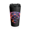 Construida con acero inoxidable duradero y diseñada con aislamiento al vacío, la taza de viaje "Cosmic Echoes" está diseñada para mantener la temperatura de sus bebidas, ya sea que prefiera la calidez de un café estelar o la frescura de un té nebular helado. Las calaveras iridiscentes de la taza, símbolos del pasado, presente y futuro, son un vívido tapiz de fractales de neón, espirales y llamas cósmicas que parecen bailar con vida contra el vacío del espacio.