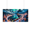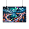 Un tren clásico, adornado con coronas y cintas, serpentea a través de un paisaje prístino cubierto de nieve. El paso del tren está marcado por el suave brillo de las luces festivas colocadas a lo largo de los vagones, haciéndose eco del resplandor de la aurora en el cielo. A orillas de un lago en perfecta calma, que refleja el ballet celestial en su superficie similar a un espejo, se encuentra un pintoresco pueblo. Sus casas cálidamente iluminadas y el campanario de una encantadora iglesia se elevan pacíficamente contra el telón de fondo de las majestuosas montañas cubiertas de nieve. Los pinos, cubiertos de nieve y envueltos en luces parpadeantes, bordean la ruta del tren, guiando la vista a través de este encantador cuadro invernal. Este cartel no sería sólo un regalo visual sino una invitación al espectador a embarcarse en una aventura navideña mágica, donde el viaje en sí sea tan conmovedor como el destino.