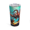 Este sería un vaso de acero inoxidable de 20 oz con una escena submarina de colores vibrantes. La imagen envuelve el vaso y muestra un encuentro dramático entre la vida marina. En primer plano, hay un pez grande y expresivo con la boca bien abierta, como atrapado en pleno movimiento, sobre un fondo repleto de una variedad de organismos parecidos a los corales. La característica dominante de la imagen es un pulpo majestuoso, con sus tentáculos extendidos en un despliegue de intrincados detalles y vibrantes tonos de naranja, rojo y morado. El pulpo parece estar en una postura asertiva, añadiendo una tensión dinámica a la escena. El fondo se desvanece en un azul sereno, simulando las profundidades del océano, con gradientes sutiles que sugieren la luz filtrándose a través del agua. Toda la imagen es rica en texturas, desde la suave piel del pulpo hasta las estructuras rugosas parecidas a plantas del fondo marino, lo que brinda una experiencia táctil al poseedor del vaso.