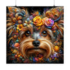 El uso de flores en el diseño no es arbitrario. Cada uno ha sido elegido y colocado con intención deliberada, contribuyendo a la narrativa de un estado sereno y onírico donde todas las criaturas encuentran paz y felicidad. La figura central, un perro encantador con ojos llenos de alma y comprensión, ancla la composición, invitando a los espectadores a este mundo fantástico y exuberante.