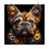 La imagen, contrastada con un fondo oscuro y profundo, ilumina los colores vibrantes y los detalles intrincados de cada pétalo y hoja que forman el pelaje único de este encantador perro. Parecido a un Bulldog Francés, el tema combina el encanto del mejor amigo del hombre con la belleza surrealista y floreciente de un jardín primaveral en pleno florecimiento.