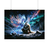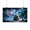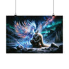 El telón de fondo es un paisaje sereno y nevado por la noche, bajo un cielo iluminado por la aurora boreal, lo que añade una sensación de magia y sobrenatural a la escena. Los árboles cubiertos de nieve y las montañas distantes crean una sensación de aislamiento, como si este momento fuera compartido sólo entre el guerrero, su compañero cósmico y el testigo silencioso del cosmos. La composición general evoca una historia de deber, compañerismo y la eterna vigilancia sobre los reinos visibles e invisibles.
