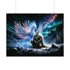 Al lado del guerrero hay una criatura fantástica que recuerda a un fénix, pero con un toque cósmico. Sus plumas son un tapiz de belleza galáctica que contiene estrellas, nebulosas y los colores vibrantes de un universo distante. Esta ave celestial parece ser a la vez guardiana y compañera del guerrero, con sus alas desplegadas en una postura protectora.
