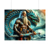 La imagen del cartel representa una escena de fantasía en la que aparece un señor de la guerra majestuoso y poderoso. Esta figura es alta y segura, con una constitución musculosa, una larga barba blanca y tatuajes intrincados que adornan sus brazos y pecho. Está vestido con el traje tradicional de guerrero, con una capa forrada de piel, y porta una variedad de armas de aspecto antiguo, lo que sugiere su destreza en la batalla.