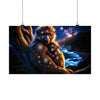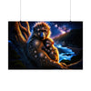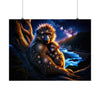 Este encantador póster captura el tierno abrazo entre dos primates de otro mundo, cuyo pelaje es un tapiz radiante de galaxias arremolinadas y misterios celestiales. Bajo el velo de un cielo repleto de estrellas, se posan sobre un árbol antiguo que parece tender un puente entre el reino terrenal y el cosmos. Con ojos que reflejan el universo infinito, contemplan la noche, su silueta enmarcada por la impresionante curvatura de la Vía Láctea. Su cercanía, con el telón de fondo de un sereno paisaje costero al atardecer, evoca una sensación de amor universal y la profunda conexión entre todas las criaturas vivientes. Esta cautivadora imagen invita al espectador a reflexionar sobre nuestro lugar en la inmensidad del espacio, fomentando un momento de reflexión sobre la danza cósmica de la que todos somos parte.