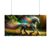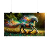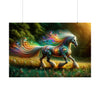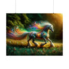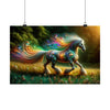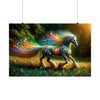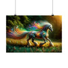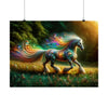 En "Enchanted Elegance", el caballo se alza orgulloso y sereno en un claro moteado de sol, su melena y cola son una exhibición fantástica de colores iridiscentes que fluyen como luz líquida. La melena ondea en un espectro de tonos luminosos; cada mechón está detallado con patrones etéreos, que se asemejan al delicado trabajo de un artesano celestial. El pelaje del caballo está adornado con una elegante variedad de diseños ornamentados que brillan con un brillo de otro mundo, cautivando la atención del espectador e invitándolo a mirar más profundamente en la imagen.