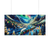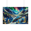 La escena se desarrolla en un valle apartado, acunado por montañas cubiertas de nieve bajo un cielo pintado con los vibrantes tonos de la aurora boreal. Un antiguo tren de vapor, el "Winter Express", expulsa humo blanco mientras avanza por una vía sinuosa que abraza un río helado, y sus vibrantes vagones sugieren una atmósfera cálida y festiva en su interior. Esparcidas por el valle, acogedoras cabañas de madera brillan con una luz dorada y ofrecen un acogedor respiro del frío. Los pinos cubiertos de nieve, adornados con coloridas luces navideñas, marcan el paisaje y sus luces centelleantes se reflejan en la superficie helada del río. La escena es una mezcla de maravilla natural y alegría navideña, invitando a los espectadores a imaginarse embarcándose en una aventura inolvidable para descubrir la magia de la temporada.