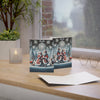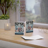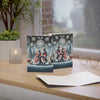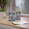 Esta tarjeta de felicitación presenta una caprichosa escena invernal que irradia una atmósfera festiva y encantadora. En el centro de la imagen hay dos figuras que recuerdan a los icónicos Papá Noel y la Sra. Claus, ambos adornados con ornamentadas prendas de invierno rojas con intrincados patrones blancos que imitan la apariencia de delicados copos de nieve y remolinos, agregando un toque mágico. Sus conjuntos están detallados con ricas texturas que dan una sensación de profundidad y calidez, adecuada para la temática invernal. A su alrededor hay un sereno paisaje forestal cubierto de nieve, con árboles de hoja perenne altos y parcialmente cubiertos de escarcha. Arriba, el cielo es un degradado de azules fríos y está salpicado de elaborados copos de nieve que descienden suavemente hacia el suelo, lo que aumenta el encanto general de la escena. Acompañando a las Cláusulas hay varios renos, incluido uno con un conjunto de astas particularmente majestuoso, todos representados con un patrón estilístico similar y puntos que complementan a las figuras principales. La imagen transmite una sensación de alegría y el espíritu de la temporada navideña, lo que la hace perfecta para una tarjeta de felicitación navideña.