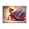Adéntrate en un mundo donde el color da vida y el movimiento teje magia con nuestro impresionante póster "Elegancia floral en movimiento". Esta exquisita pieza presenta a una mujer enigmática, guardiana de la vitalidad, avanzando con confianza mientras su magnífico vestido florece con una interminable cascada de flores. Cada paso que da es una sinfonía de color, transformando el espacio que la rodea en un lienzo de arte vivo.