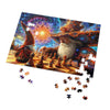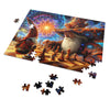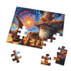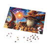 Este rompecabezas representa un duelo mágico entre dos poderosos magos, ilustrado con un estilo encantador y vívidamente detallado. La escena se desarrolla sobre un tablero de ajedrez, donde los magos, vestidos con túnicas ornamentadas y sombreros altísimos ricos en motivos cósmicos y florales, parecen profundamente absortos en su juego. El mago mayor de la derecha, con una larga barba blanca y una conducta tranquila, se acerca para mover una pieza. Su sombrero y su túnica parecen mezclarse con las galaxias y nebulosas arremolinadas del fondo, lo que significa su inmenso poder y conexión con el universo.