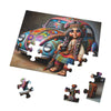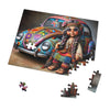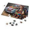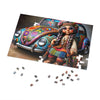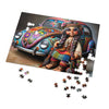 Este rompecabezas presenta un Volkswagen Beetle de colores vibrantes y con temática de poder floral, adornado con patrones intrincados y símbolos de paz. Aparcado al lado hay un personaje caprichoso parecido a un gnomo con una expresión entrañable y que lleva gafas de sol redondas de gran tamaño. Su atuendo es un mosaico de estilo bohemio, con una falda de capas multicolores, un chal con flecos y accesorios en tonos tierra. Lleva una maleta con un diseño similar, lo que sugiere el comienzo de un viaje mágico. Las texturas son ricas y detalladas, y ofrecen un desafío encantador para los entusiastas de los rompecabezas. El tono general de la imagen es divertido y nostálgico, haciendo eco de las vibraciones de espíritu libre de los años 1960 y 1970.