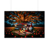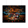 El cartel presenta una vasta pradera, viva con el suave brillo carmesí de miles de luciérnagas, cada una de las cuales contribuye a un espectáculo de luminiscencia natural que parece bailar a través del cartel. En el corazón de esta radiante exhibición se encuentra un acogedor picnic, cuidadosamente arreglado con delicias gnomas: diminutas copas de bellota rebosantes de brillante rocío de flor de saúco, rebanadas de pan de corteza untadas con dulce mermelada de pétalos de rosa y una reluciente botella del mejor champán burbujeante de diente de león, lista para servir. Brindo por el cariño duradero.