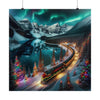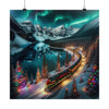 El Midnight Mirage, un tren antiguo adornado con coronas y luces navideñas, atraviesa la quietud de un paisaje nevado y su faro atraviesa el crepúsculo. Reflejándose en la superficie cristalina de un tranquilo lago alpino, el paso del tren se refleja en la danza celestial de las auroras superiores, creando una escena de doble encanto. A lo largo de la vía férrea, hileras de pinos brillan con luces multicolores y guían al Mirage en su recorrido nocturno. Algunas acogedoras cabañas a la orilla del agua, con sus luces proyectando un brillo acogedor, sugieren la calidez y el confort que aguardan en el interior. Este cartel capturaría la esencia de una mágica noche de invierno, donde la realidad se mezcla con paisajes oníricos y la belleza de la estación susurra en el silencio de las montañas.
