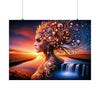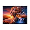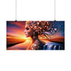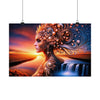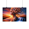 El póster tiene un tamaño que llama la atención sin resultar abrumador, perfecto para crear un punto focal en una habitación minimalista o agregarlo a la pared de una galería para darle un toque ecléctico. Los tonos ricos y cálidos del sol poniente se yuxtaponen con los azules fríos de la cascada, creando una armonía visual que puede complementar una variedad de estilos de diseño de interiores.