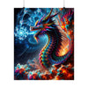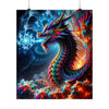La imagen representa una escena vibrante y de otro mundo que parece ser una fusión de elementos cósmicos y fantásticos. La pieza central es un majestuoso dragón que exuda un aura de poder y misterio. Sus escamas son un caleidoscopio de colores que parecen arder con un fuego interior, contrastando con los remolinos fríos y nebulosos de un fondo cósmico. Este dragón no es sólo una bestia ordinaria; encarna una fuerza elemental, con un plumaje ardiente que se fusiona perfectamente con el infierno circundante, lo que sugiere que puede ser el maestro tanto de las creaciones estelares como de la destrucción.