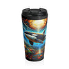 La taza de viaje muestra la belleza surrealista de una orca ornamentada, con su cuerpo adornado con un tapiz de diseños intrincados, nadando a través de una explosión de flora y fauna marina. El arrecife está lleno de vida con un brillante espectro de colores, desde los azules más profundos hasta los corales más radiantes, creando un fondo deslumbrante que parece cobrar vida con cada observación.