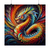 Este vibrante póster presenta un dragón mítico en un remolino de colores, que encarna la esencia del fuego y la fantasía. Las escamas del dragón se representan en un caleidoscopio de tonos cálidos (rojos, naranjas, amarillos) que se gradúan hacia tonos más fríos de azules y verdes, creando una combinación armoniosa de temperatura y textura. Cada escala está intrincadamente detallada con patrones que recuerdan a cachemira y mandalas, que le dan a la criatura una sensación de sabiduría antigua y poder cósmico.