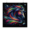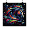 El póster "Stellar Mane" es un testimonio vibrante de la belleza cósmica que se puede imaginar cuando lo celestial y lo equino se combinan en una imagen fascinante. La obra de arte se centra en el noble perfil de un caballo, su mirada hacia adelante, exudando una fuerza y sabiduría silenciosas. La característica definitoria de esta impresionante pieza es la melena del caballo, un espectro fluido de colores que se arquea y se riza como las mismas nebulosas y sistemas estelares que lo inspiran.