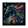 En tonos que abarcan todo el espectro visual, desde rojos cálidos hasta violetas fríos, cada hebra de la melena parece orbitar alrededor de la silueta del caballo como cuerpos celestes en una gran danza astronómica. Las espirales y rizos de la melena recuerdan a los brazos espirales de las galaxias; cada bucle y verticilo es un patrón hipnótico de creación y movimiento estelar. Contra el profundo negro azulado del espacio, puntuado por el centelleo de las estrellas y las formas esféricas de los planetas, la imagen sugiere un universo donde todo está conectado en un hermoso y eterno ballet.