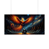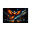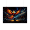 Cada detalle, desde la brasa más pequeña del fuego del Fénix hasta la estoica compostura del Vigilante, ha sido meticulosamente elaborado para inspirar asombro y contemplación. Este cartel es un homenaje a lo mítico, lo antiguo y lo eterno: una invitación a reflexionar sobre la profunda narrativa escrita en las estrellas. Cuelga "El Renacimiento Cósmico del Fénix y el Vigilante" en tu pared y transforma tu espacio en una puerta de entrada al alma del universo, donde el canto de las llamas del Fénix y el testamento silencioso del Vigilante al tiempo resuenan como uno solo.