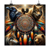 Elaborado en papel de primera calidad y sin ácido, el póster cuenta con un acabado brillante que realza la vitalidad de los colores, desde los naranjas bruñidos del pelaje del oso hasta el brillo cobalto del plumaje del cuervo y el brillo plateado del pelaje de los lobos. mirada. El atrapasueños, entretejido con una red cósmica, brilla con un brillo sutil, sumergiendo al espectador en un estado profundo y meditativo.