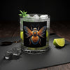 El vaso es un recipiente cristalino de 10 onzas, perfecto para una bebida refrescante. Un lado del cristal cuenta con una intrincada y vibrante ilustración de una abeja, representada con un nivel de detalle casi fantástico. Las alas de la abeja se abren en abanico en patrones delicados y ornamentados que recuerdan al encaje fino, brillando con tonos de naranja intenso y azul eléctrico contra el fondo negro intenso. El cuerpo de la abeja está representado con una atención similar al detalle, con cada pelo y segmento de su forma delineados en ámbar brillante y oro, dando a la imagen una cualidad luminosa y etérea. Este no es sólo un simple vaso para beber; es una obra de arte que celebra la belleza y la complejidad de los diseños propios de la naturaleza.