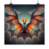 En el centro del cartel, el Pegaso se encuentra en equilibrio, con las alas extendidas en un impresionante despliegue de simetría y color. Los intrincados diseños de cachemira que adornan sus alas están representados en un caleidoscopio de naranja, azul y turquesa, brillando como si estuvieran iluminados desde dentro contra un telón de fondo de crepúsculo celestial.