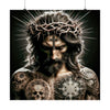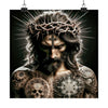 Abrace la profunda fusión del simbolismo antiguo y el arte contemporáneo con nuestro sorprendente póster, 'Espinas y tinta: el lienzo divino'. En el corazón de esta pieza visualmente deslumbrante hay una figura que representa una intersección de espiritualidad tradicional y expresión moderna. Adornada con una corona de espinas, esta representación moderna de Jesucristo lleva el peso del sacrificio y la intensidad de la sabiduría divina en su mirada contemplativa.