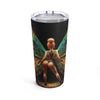 Adornando este vaso se encuentra la impresionante obra de arte digital de Tinker's Bell, un hada cuya presencia es tan imponente como cautivadora. Los colores vibrantes de sus alas fractales captan la luz y parecen bailar con la vida. Sus misteriosas runas entintadas prometen proteger tus bebidas tal como ella protege el reino de los sueños.
