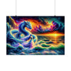 Sumérgete en el corazón del reino místico con "Whispers of the Celestial Tide", una odisea visual impresionante que captura el vínculo enigmático entre el majestuoso Azurean, el Dragón de las Mareas Crepusculares, y la etérea Serafina, la Susurradora de Mareas. Este exquisito póster, una ventana al mundo mítico de Aetherius, muestra el impresionante momento en el que el poderoso guardián del mar y el cielo se encuentra con el delicado presagio de la gracia del océano en el horizonte, donde la dorada despedida del sol besa el ondulante abrazo del mar.
