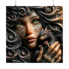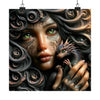 Este póster de alta calidad captura los intrincados detalles de los enigmáticos tatuajes de la doncella, la suave luminosidad de su piel y las vívidas y realistas escamas de su compañero dragón. Los ricos y oscuros rizos de su cabello, resaltados con detalles metálicos, enmarcan su rostro y crean un sorprendente contraste con los vibrantes tonos del dragón, haciendo de esta imagen no solo un póster, sino una puerta de entrada a una historia no contada.