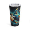 La imagen del vaso muestra una representación artística elaborada y detallada de una ballena orca. La ballena está adornada con un tapiz de intrincados patrones arremolinados que atraviesan toda su forma, creando un efecto de textura y fluidez. La paleta de colores es una mezcla armoniosa de azules fríos, verde azulado e índigos, salpicada de remolinos de naranjas, amarillos y blancos cálidos, dando a la imagen una calidad vibrante, casi luminosa, sobre el elegante fondo de acero inoxidable. La orca parece estar en movimiento, con efectos de colores que sugieren un chapoteo, evocando el hábitat oceánico natural de la majestuosa criatura. El vaso en sí, duradero y diseñado para aislar, se convierte no solo en un práctico recipiente para bebidas sino también en una obra de arte portátil, que celebra la belleza de la vida marina de una forma funcional.