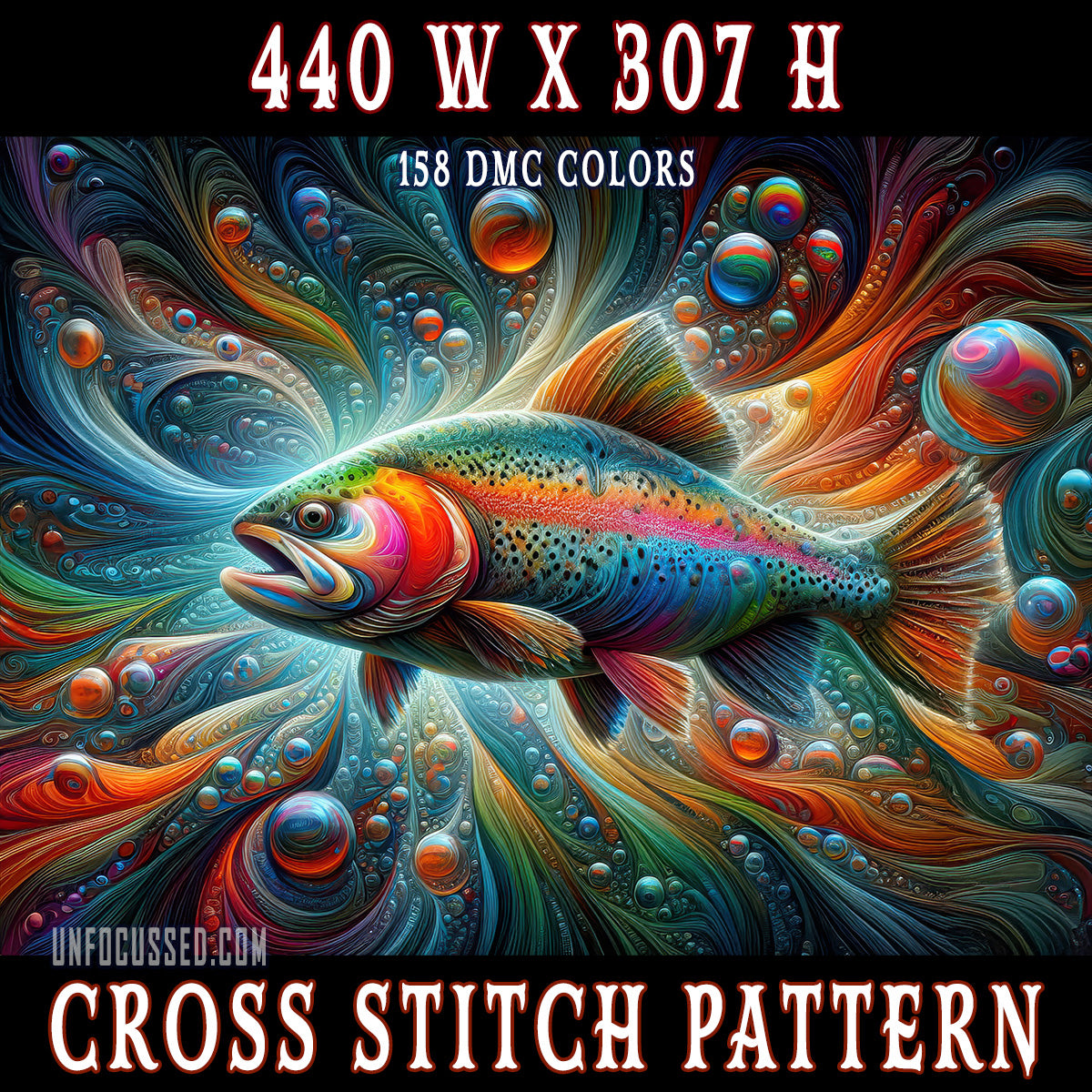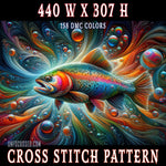 Jetez votre regard sur « Nage céleste », un motif de point de croix qui capture la danse cosmique de la grâce aquatique. Sur une vaste toile de 440 x 307 points , votre aiguille donnera vie à une truite arc-en-ciel alors qu'elle navigue dans les nébuleuses tourbillonnantes d'un univers sous-marin, rendue dans une gamme saisissante de 158 couleurs DMC .