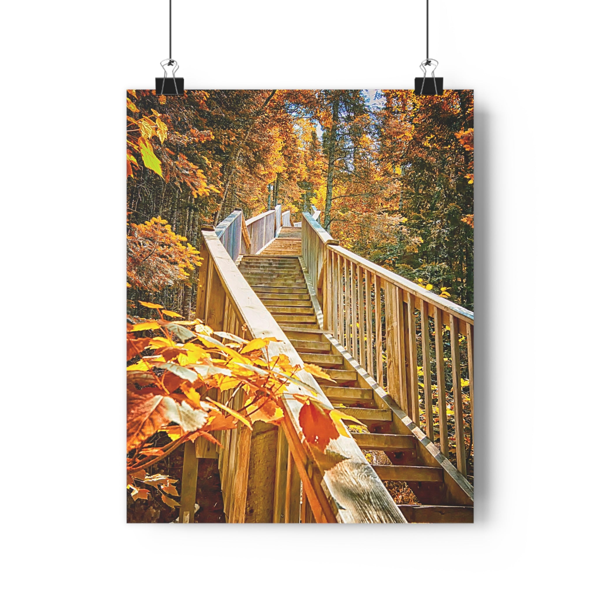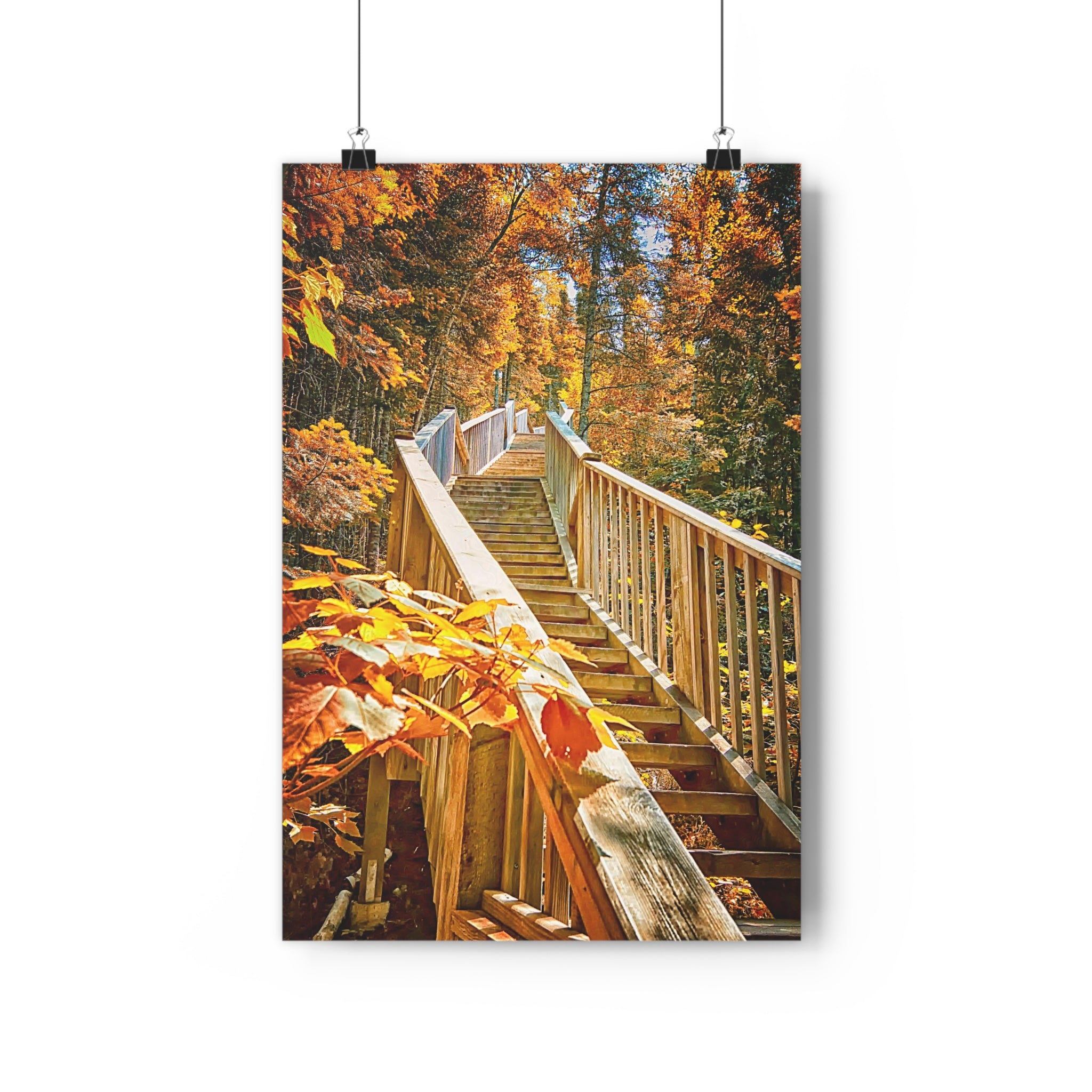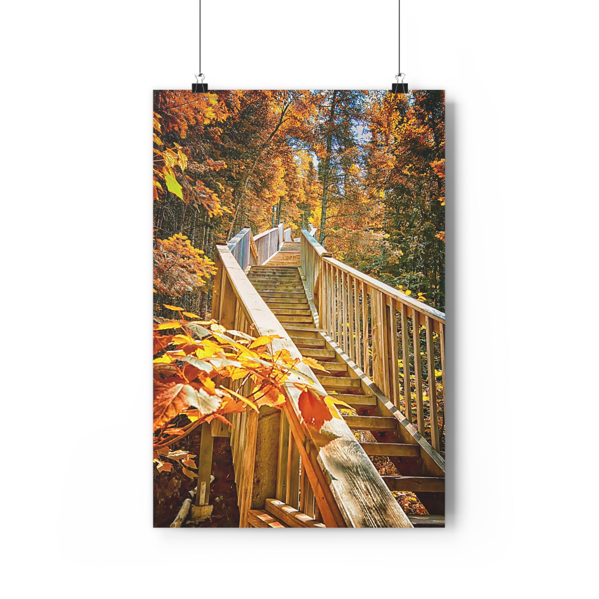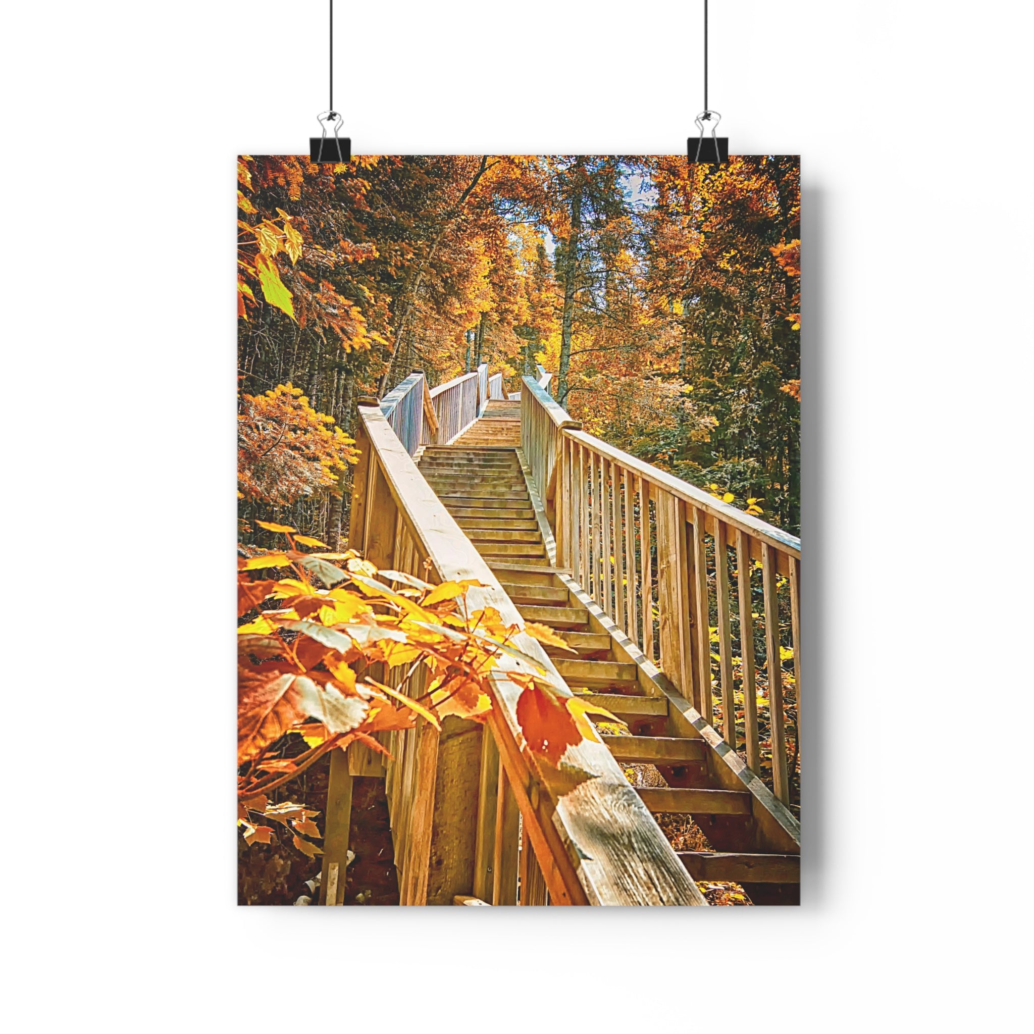 Cette image capture le charme rustique de l'escalier Devil's Kettle, une structure en bois serpentant à travers une forêt embrasée par les couleurs de l'automne. L'escalier, construit avec une rampe en bois simple mais robuste, invite les visiteurs à explorer la beauté naturelle de la région. La lumière du soleil filtre à travers la canopée, illuminant les feuilles dans des tons d'or, d'ambre et de pourpre, évoquant une atmosphère automnale par excellence. La perspective de la photo, prise depuis le pied de l'escalier, attire le regard du spectateur vers le haut, suggérant un voyage au cœur de la forêt. Les feuilles du premier plan, captées par une douce lumière, contrastent avec les ombres tachetées et soulignent le passage des saisons. Cet escalier sert non seulement de chemin fonctionnel mais aussi de couloir vers les profondeurs sereines et vibrantes des bois.