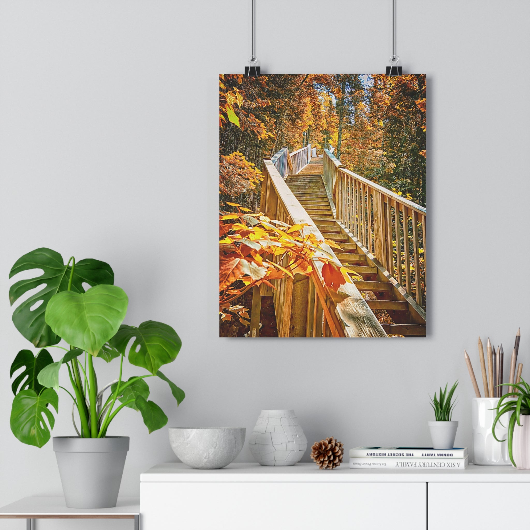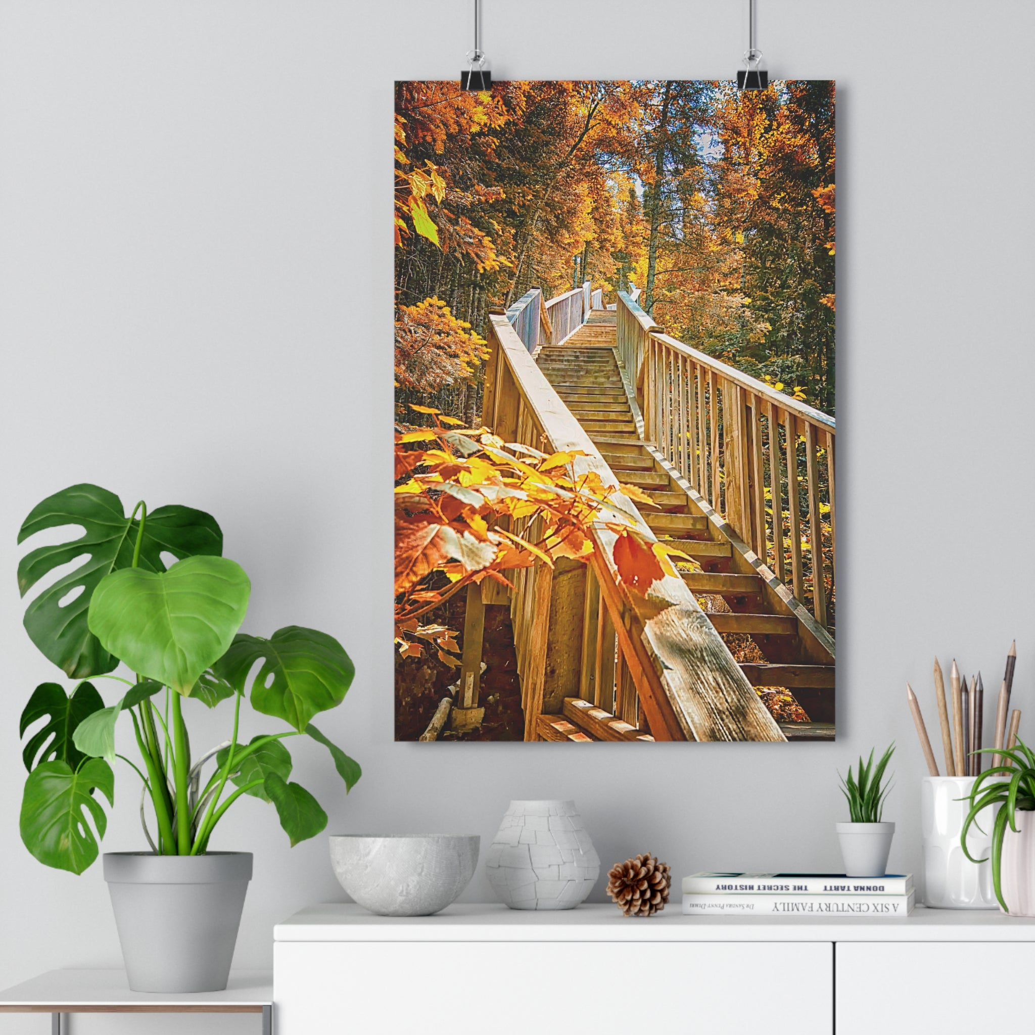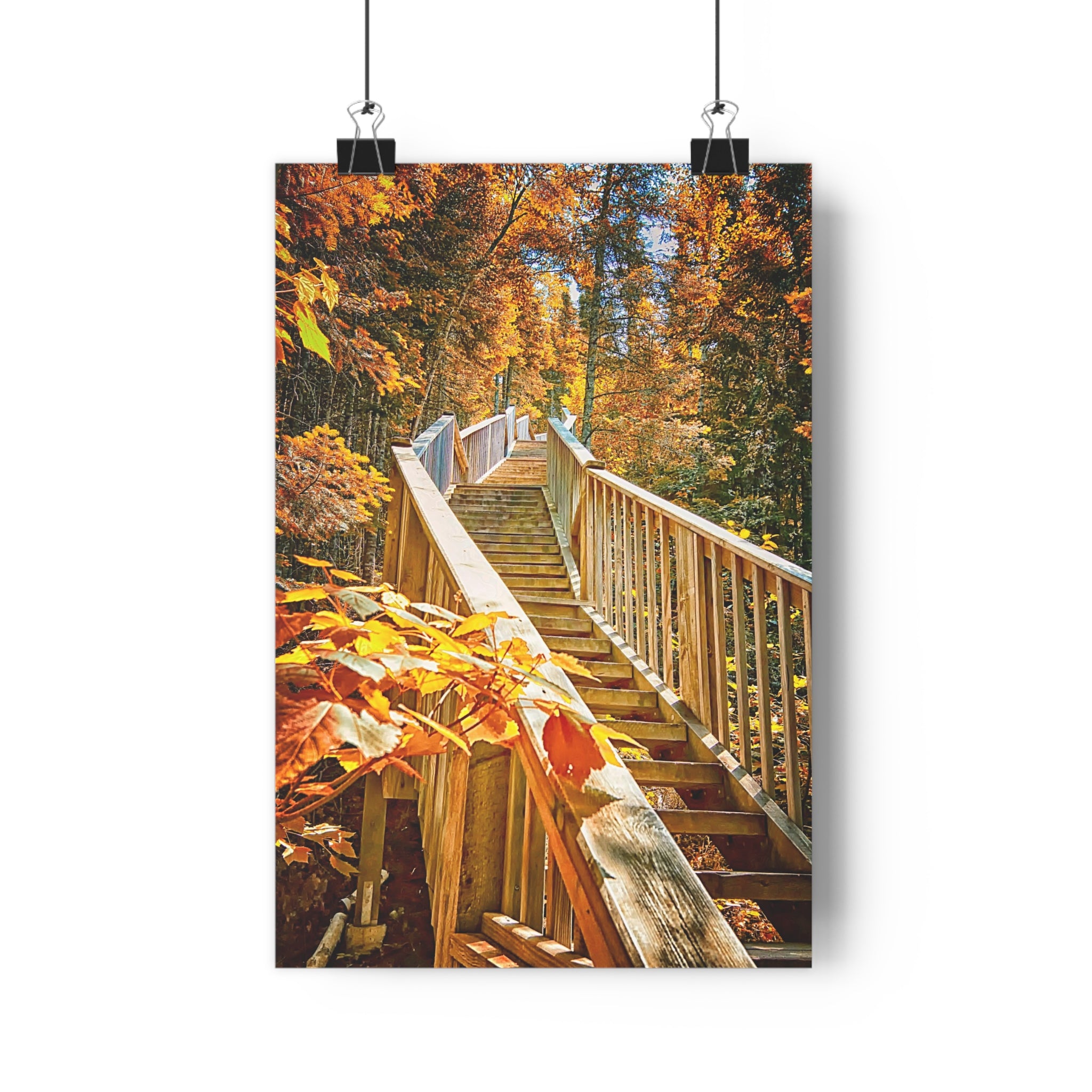 Cette image capture le charme rustique de l'escalier Devil's Kettle, une structure en bois serpentant à travers une forêt embrasée par les couleurs de l'automne. L'escalier, construit avec une rampe en bois simple mais robuste, invite les visiteurs à explorer la beauté naturelle de la région. La lumière du soleil filtre à travers la canopée, illuminant les feuilles dans des tons d'or, d'ambre et de pourpre, évoquant une atmosphère automnale par excellence. La perspective de la photo, prise depuis le pied de l'escalier, attire le regard du spectateur vers le haut, suggérant un voyage au cœur de la forêt. Les feuilles du premier plan, captées par une douce lumière, contrastent avec les ombres tachetées et soulignent le passage des saisons. Cet escalier sert non seulement de chemin fonctionnel mais aussi de couloir vers les profondeurs sereines et vibrantes des bois.