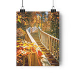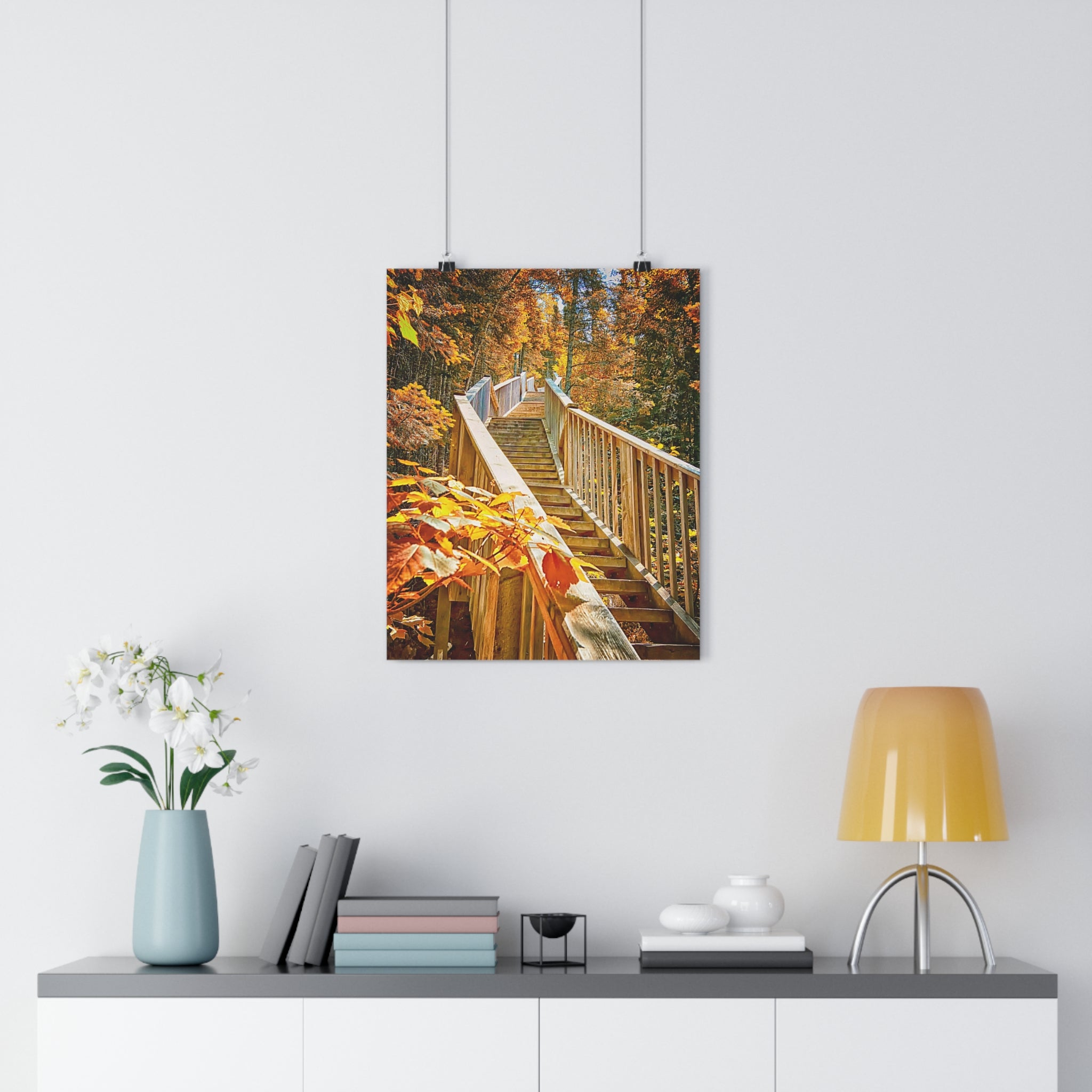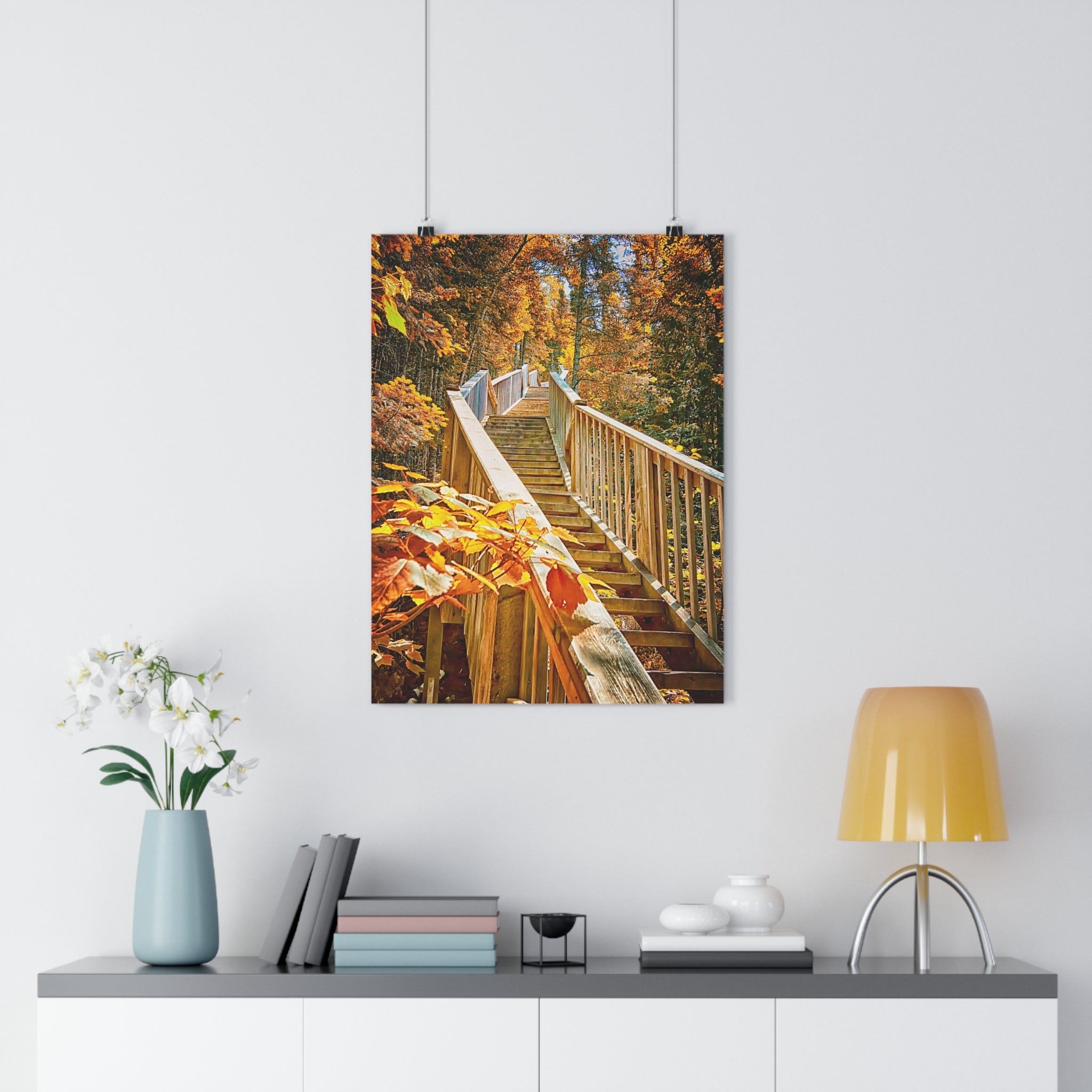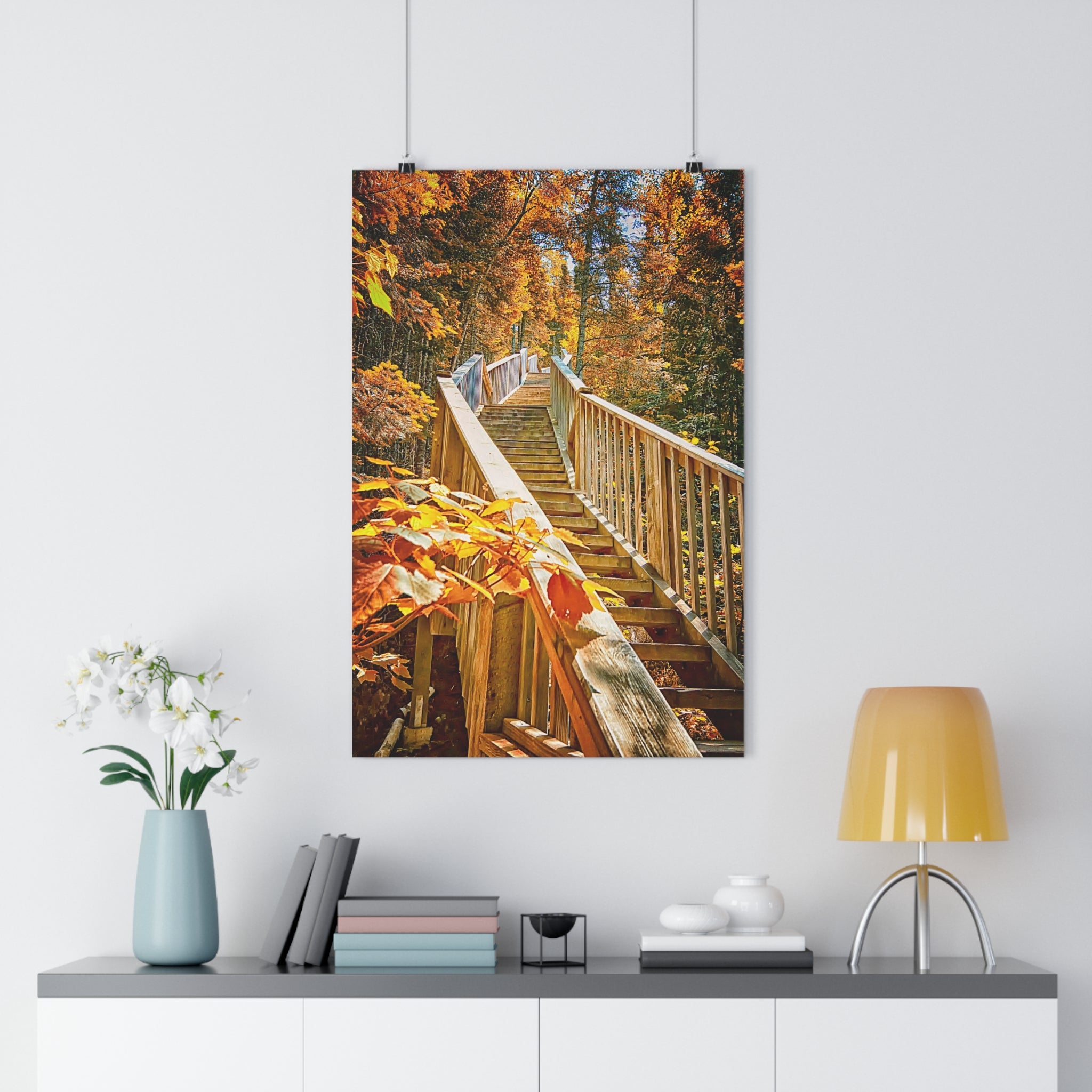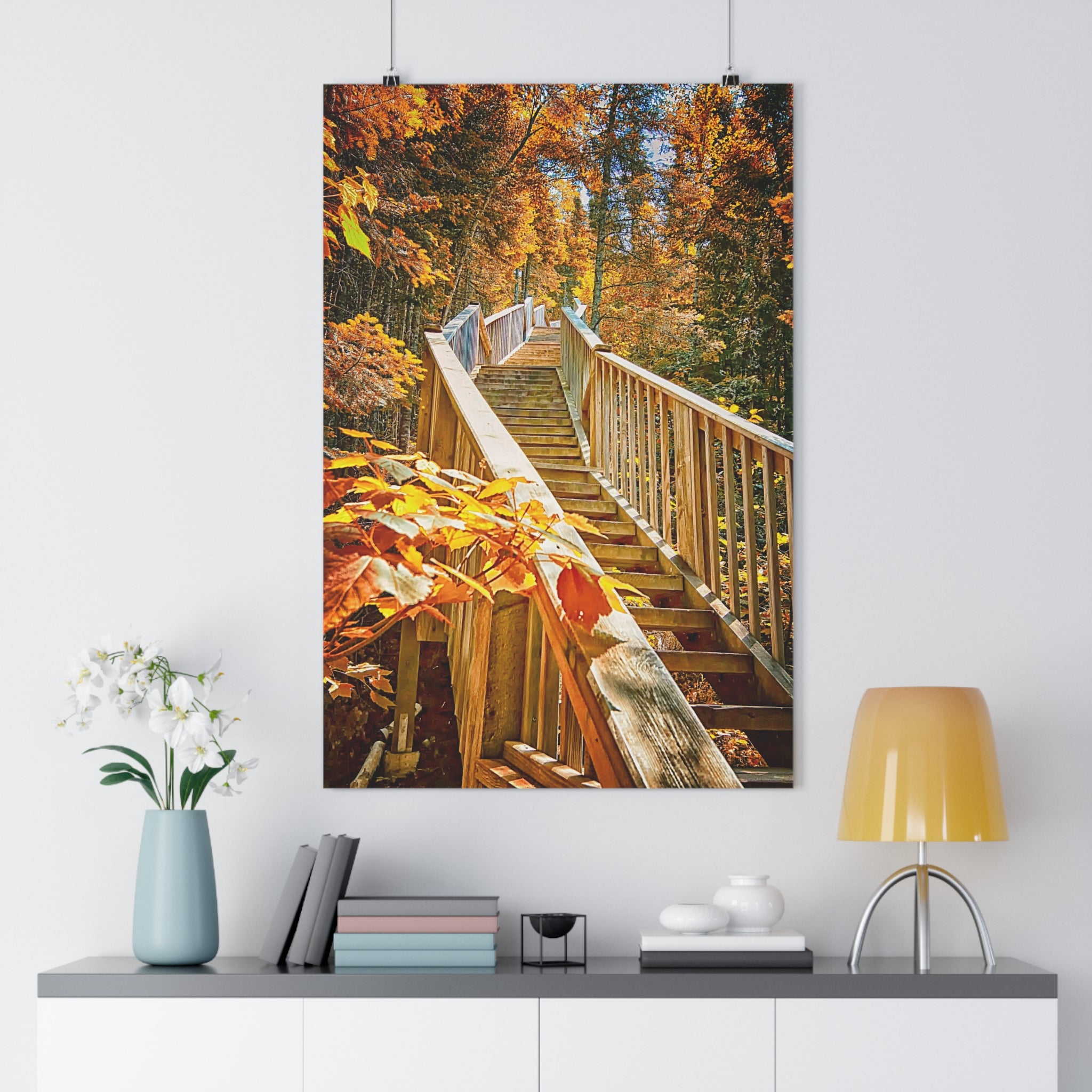 Cette image capture le charme rustique de l'escalier Devil's Kettle, une structure en bois serpentant à travers une forêt embrasée par les couleurs de l'automne. L'escalier, construit avec une rampe en bois simple mais robuste, invite les visiteurs à explorer la beauté naturelle de la région. La lumière du soleil filtre à travers la canopée, illuminant les feuilles dans des tons d'or, d'ambre et de pourpre, évoquant une atmosphère automnale par excellence. La perspective de la photo, prise depuis le pied de l'escalier, attire le regard du spectateur vers le haut, suggérant un voyage au cœur de la forêt. Les feuilles du premier plan, captées par une douce lumière, contrastent avec les ombres tachetées et soulignent le passage des saisons. Cet escalier sert non seulement de chemin fonctionnel mais aussi de couloir vers les profondeurs sereines et vibrantes des bois.
