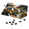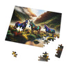 Avec chaque pièce imbriquée, révélez le dynamisme des trois ânes éthérés, gardiens de la vallée, leurs manteaux d'une gamme fascinante de couleurs tourbillonnantes qui brillent sur le fond verdoyant. Solara, aux teintes de la première lumière de l'aube, Caelum, dans les nuances enflammées du crépuscule, et Aura, reflétant la terre fertile, se dressent fièrement au cœur de cette scène complexe.