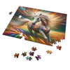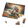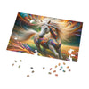 Ce puzzle, intitulé « Destrier Dreamweaver de la prairie enchantée », représente un magnifique cheval qui semble émerger du cœur d'un paysage onirique fantastique. La crinière et le pelage fluides du cheval tourbillonnent avec une gamme de couleurs vibrantes, se fondant dans la prairie surréaliste qui s'étend jusqu'à l'horizon. Mélange de beauté équine naturelle et d'expression artistique d'un autre monde, le puzzle offrirait un défi captivant à assembler, car ses motifs complexes et son spectre de couleurs s'entrelacent dans une danse fascinante de teintes. Chaque pièce s'assemblerait pour révéler lentement la créature éthérée et son environnement enchanteur, ce qui en ferait une pièce parfaite pour ceux qui aiment à la fois les puzzles et la beauté des paysages mythiques.