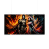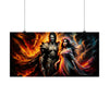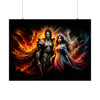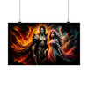 Cette affiche n’est pas seulement de l’art ; c'est un portail vers un royaume mythique où l'étreinte éternelle de deux divinités puissantes devient le point d'appui sur lequel repose le destin de leurs mondes. Accrochez « Eternal Embrace » sur votre mur et laissez-le être un rappel quotidien de la passion féroce et de la sérénité paisible qui coexistent dans l'univers, et peut-être en nous-mêmes. C'est une invitation à réfléchir sur les profondeurs de l'amour qui défie les frontières de la réalité, un amour qui perdure et brûle avec éclat dans la vaste toile du cosmos.