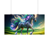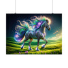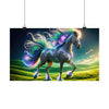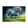 "Fluorescent Mystique" - Entrez dans un monde où la fantaisie galope à travers les teintes vibrantes de l'imagination. Cette superbe affiche représente un zèbre majestueux, dont les rayures tourbillonnent avec un kaléidoscope de couleurs fluorescentes, brillant d'une lumière surnaturelle. Chaque courbe et torsion de sa crinière et de sa queue est un chef-d'œuvre, finement tissé de nuances qui scintillent sur le vert luxuriant d'un paysage onirique et vallonné. Alors que le soleil se couche vers l'horizon, projetant une lueur chaleureuse sur la scène, le zèbre se présente comme une sentinelle du surréaliste, une créature à la fois sauvage et merveilleusement fantaisiste. Cette pièce est une célébration de la couleur, de la lumière et de l’esprit indompté qui danse au cœur des rêves les plus vivants de la nature.