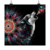 Au-dessus du loup, la toile sombre de l’espace contraste parfaitement avec l’affichage lumineux, avec des motifs de mandala qui suggèrent une connexion spirituelle entre le terrestre et le divin. Le design complexe invite l'observateur à se perdre dans ses profondeurs, découvrant de nouvelles formes et significations à chaque regard.