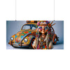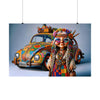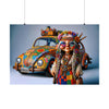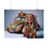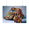 Présentation de notre affiche Journey to Grooveland – un hommage à l'esprit des années 60 et à l'attrait intemporel de la route ouverte. Cette affiche est une toile qui déborde de joie et de liberté de l'ère hippie, avec une impression haute définition d'un gnome jubilatoire nommé Sunbeam, qui est l'incarnation même de la paix et de l'amour. Avec ses tresses fantaisistes ornées de perles et de plumes et ses lunettes rondes aux couleurs de l'arc-en-ciel reflétant un monde de possibilités, elle se tient à côté de son fidèle compagnon - une Volkswagen Beetle vintage magnifiquement peinte qui est aussi prête pour l'aventure qu'elle.
