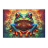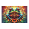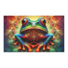 Le design du tapis présenterait une image vibrante et richement détaillée d’une grenouille assise au centre avec ses membres étalés. Les yeux de la grenouille sont surdimensionnés et étonnamment vifs, avec des bleus profonds et des reflets suggérant un sentiment de sagesse et d'attrait. Sa peau est une fantastique mosaïque de couleurs, comprenant des nuances de rouge, d'orange, de vert, de bleu et de violet, chaque couleur se fondant parfaitement dans la suivante. Les motifs ressemblent à une collection de bulles ou d'orbes, chacun variant en taille et créant une texture presque tridimensionnelle sur le corps de la grenouille.