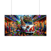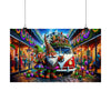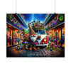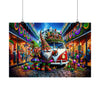 Chaque centimètre de ce festin visuel est un hommage au joyeux chaos du Mardi Gras - des balcons fantaisistes décorés débordant de perles aux sons émouvants du jazz qui semblent jaillir de la scène. Au centre de l'affiche, les gnomes se tiennent en tenue de fête, rayonnant la gaieté contagieuse de la saison. Derrière eux, une camionnette classique ornée des insignes festifs sert de toile de fond, symbolisant le voyage et le charme intemporel de la route.