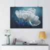 De douces tulipes blanches chuchotent dans la lueur bleue de minuit, se dirigeant vers le chemin qui brille