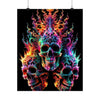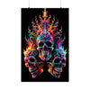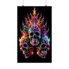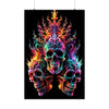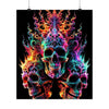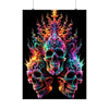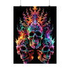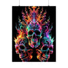 Entrez dans les profondeurs mystiques de l'inconnu avec « Neon Requiem », une affiche captivante qui témoigne de l'art de l'ère numérique. Trois crânes cosmiques émergent des abysses, alignés dans un totem vertical de transcendance sur un vide noir et austère. Chaque crâne éclate d'un spectre irisé de couleurs néon, leurs contours étant définis par le dynamisme électrique des fractales psychédéliques.