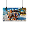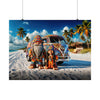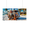 Cette affiche n'est pas seulement une œuvre d'art ; c'est une invitation à l'errance, au rêve et à la joie des plaisirs simples de l'amitié et de la liberté. Il est parfait pour tous ceux qui aiment la route, valorisent la paix et apprécient profondément la beauté de la nature. Laissez « Nomadic Nostalgia: The Gnomes' Beach Retreat » vous transporter dans un endroit où le temps ralentit et où la vie est une toile peinte avec les coups de pinceau de l'amour et de la paix.
