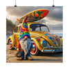 Laissez vos murs raconter une histoire d'aventure et de couleurs avec notre affiche « Rainbow Nomad's Coastal Quest ». Cette pièce accrocheuse capture l'essence de l'exploration, mettant en vedette Ziggy, le gnome au cœur aussi large que l'océan et au chapeau qui détient les secrets de l'univers. Posté à côté de sa légendaire VW Bug à fleurs, Ziggy se dresse comme une sentinelle de paix et d'harmonie sur une plage où le dernier arc du soleil peint le ciel de promesses de liberté et de rêves.