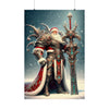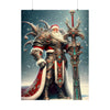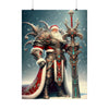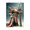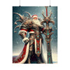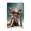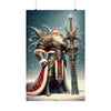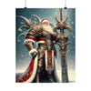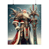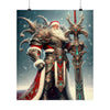 Admirez le spectacle impressionnant du Père Noël le Vaillant, gardien de Yuletide Glee, alors qu'il se tient debout au milieu des vastes neiges du Nord. Cette affiche en édition limitée représente le guerrier mythique en tenue vestimentaire complète, son armure richement conçue scintillant de filigranes d'argent complexes et de pierres précieuses turquoise vibrantes qui scintillent dans l'étreinte hivernale. Une majestueuse cape rouge tombe en cascade de ses larges épaules, traînée par les vents glacials, symbolisant la chaleur et l'esprit de Noël.